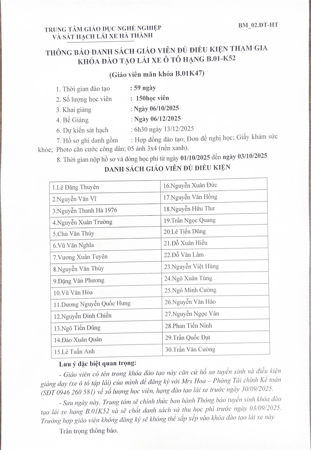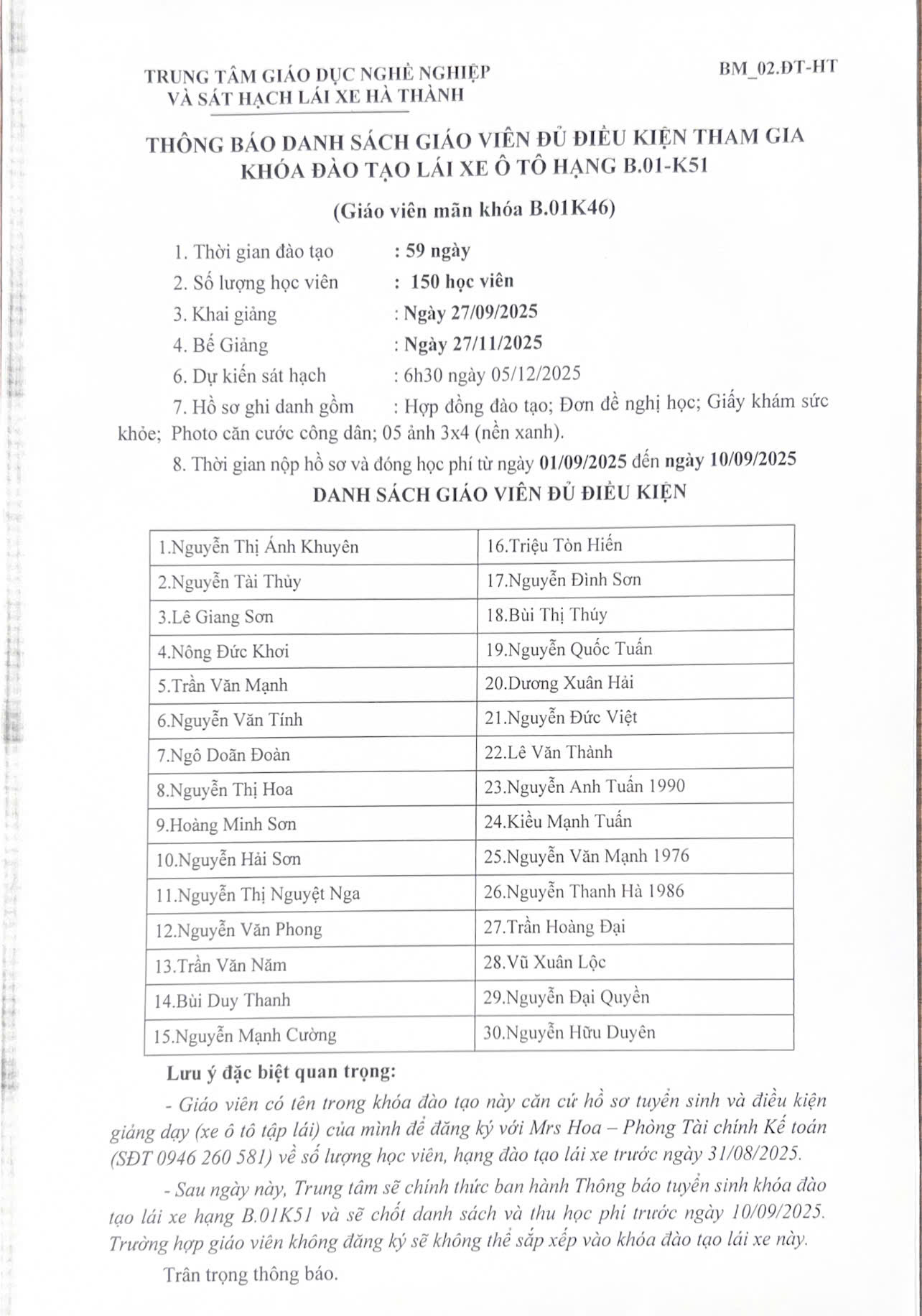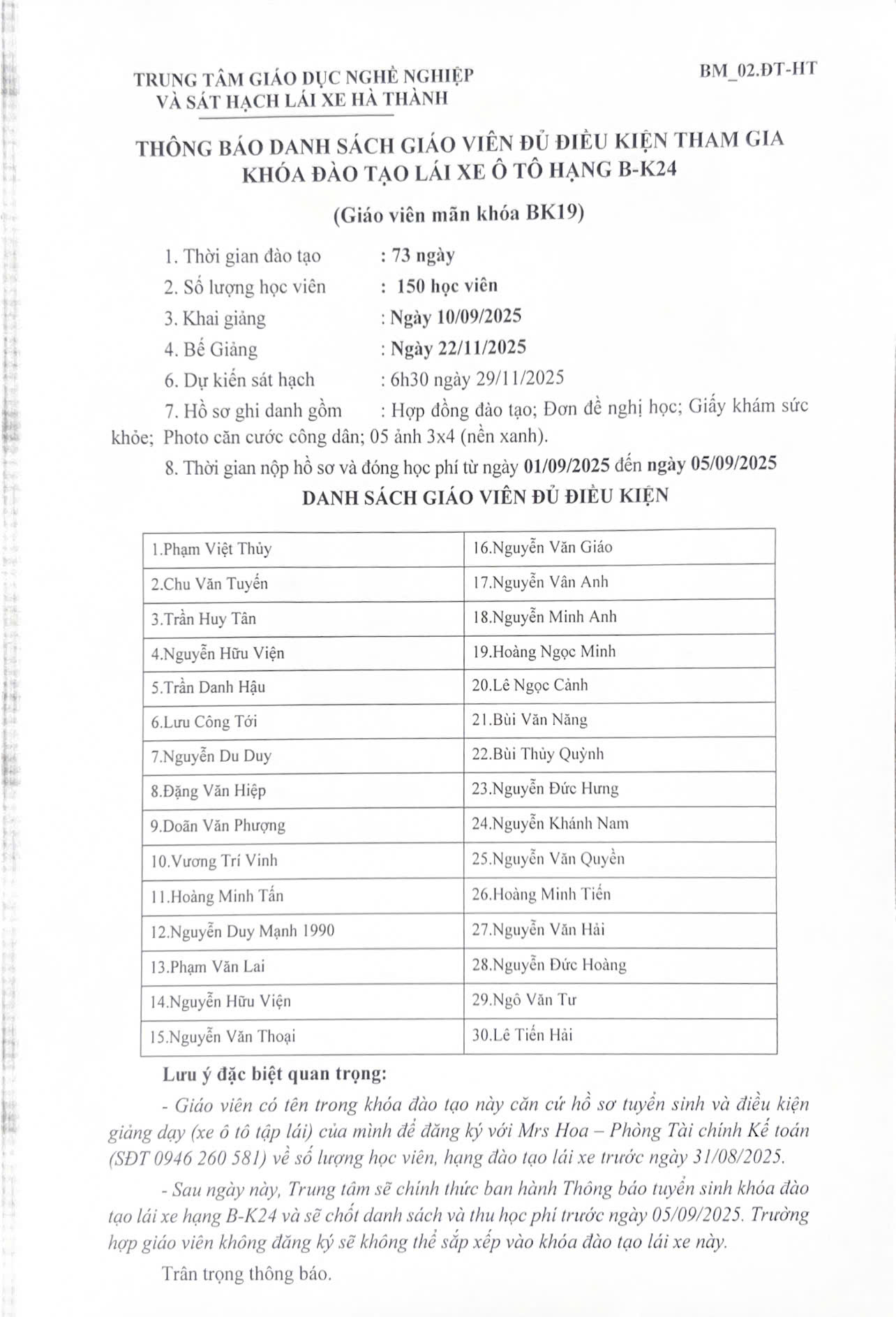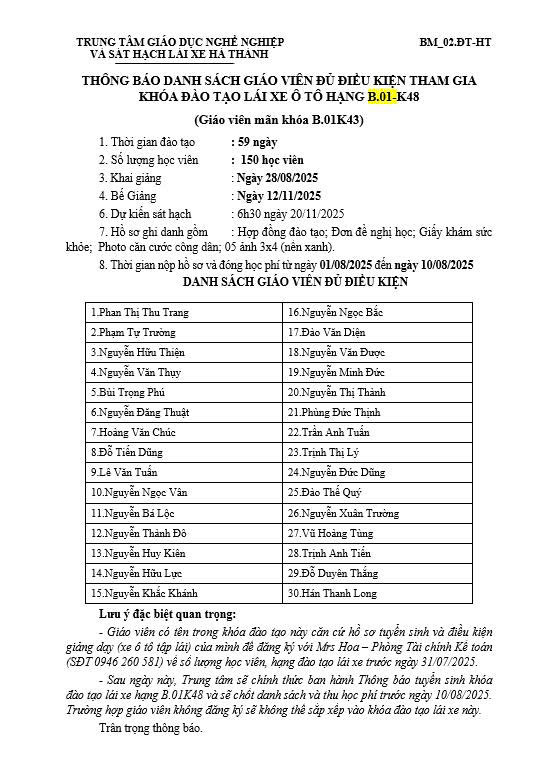 - Danh sách học viên đủ điều kiện sẽ được thông báo vào 13h ngày 06/09/2025.