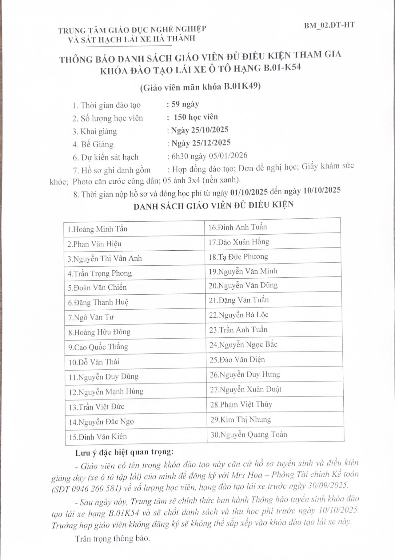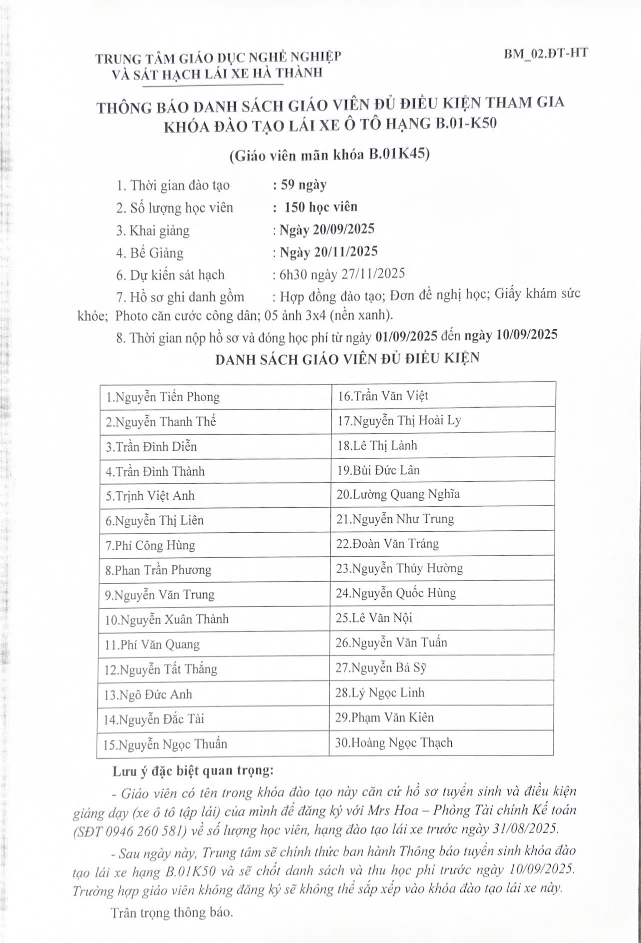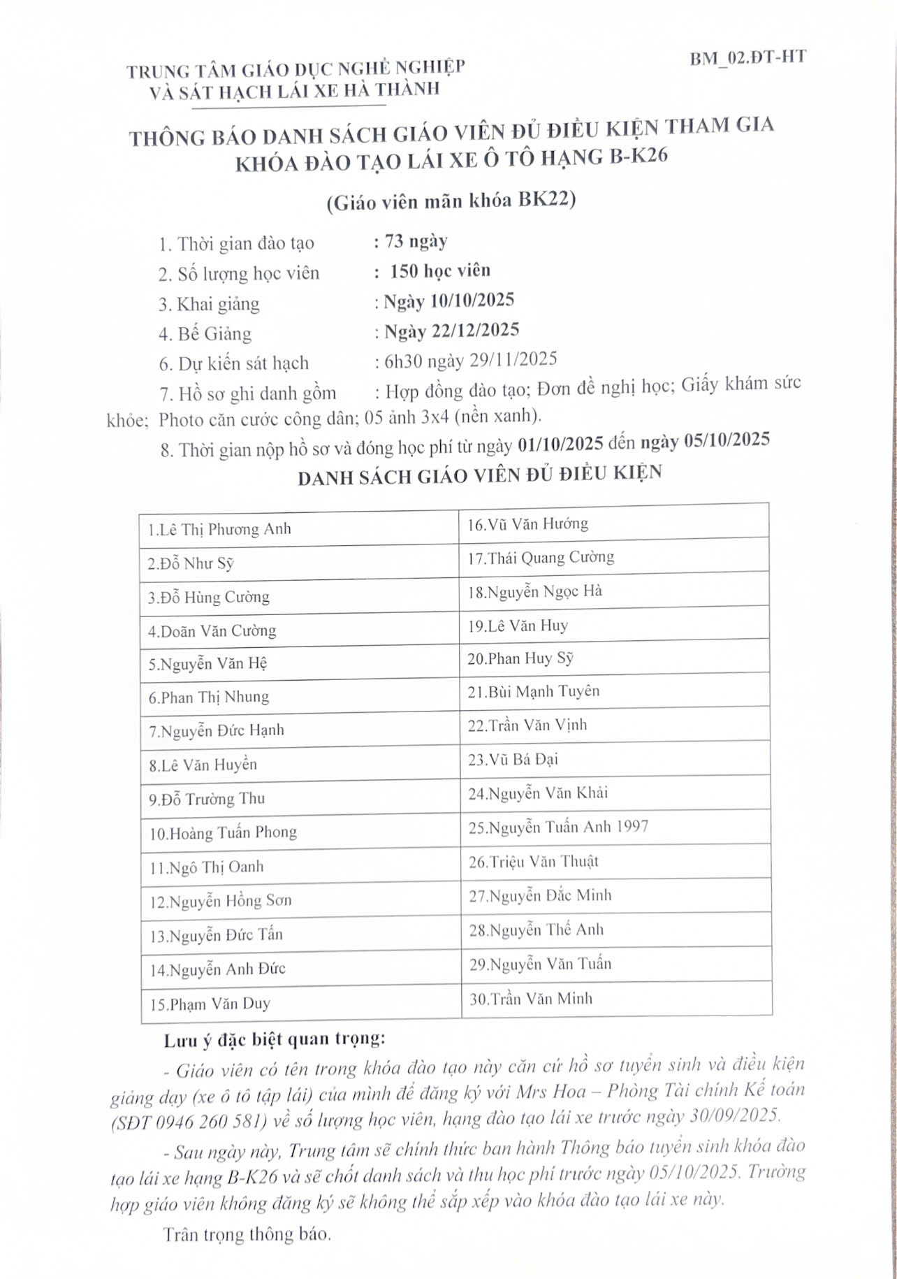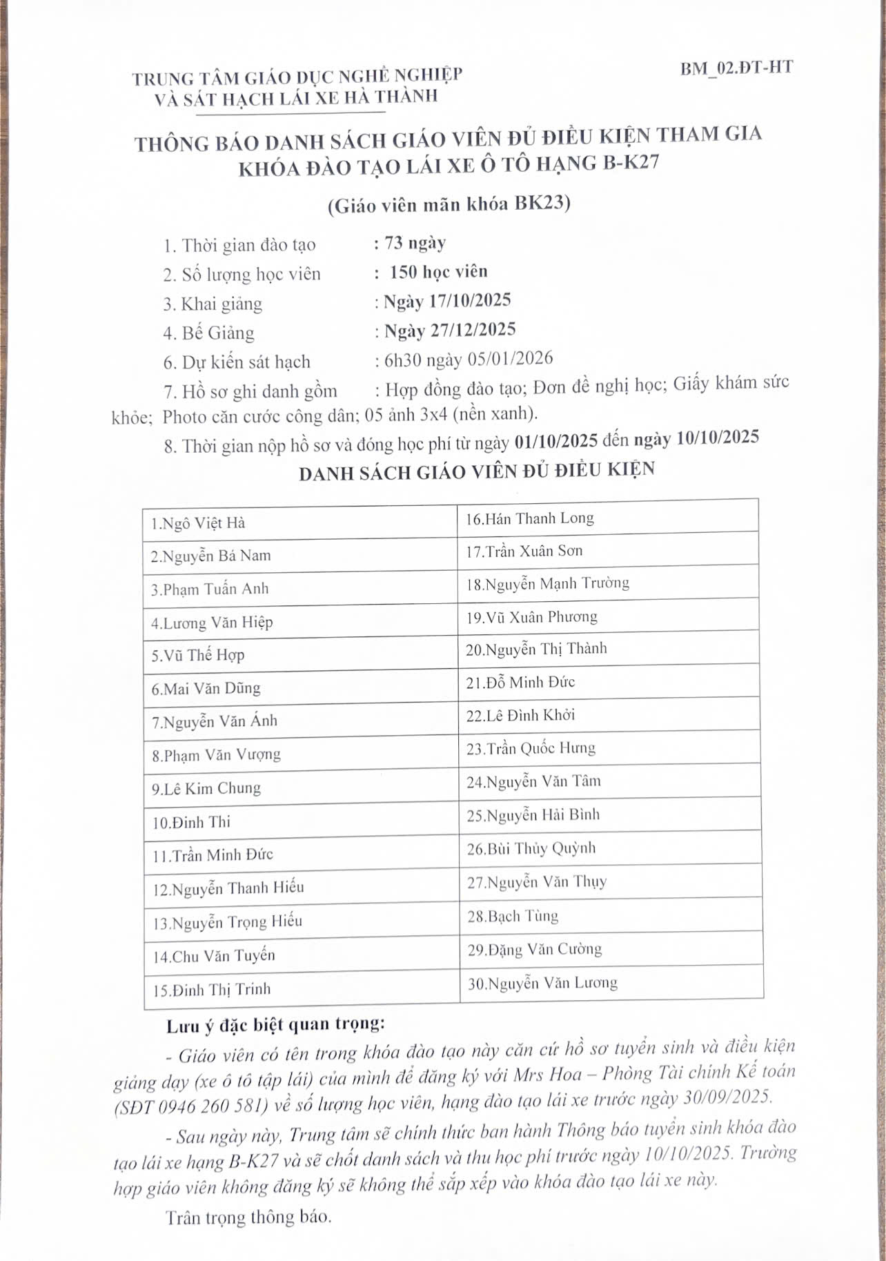 - Danh sách học viên đủ điều kiện sẽ được thông báo vào 13h ngày 06/09/2025.