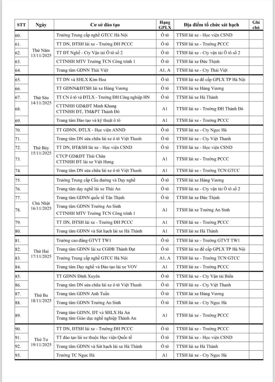 Lịch khai thi sát hạch tháng 11/2025