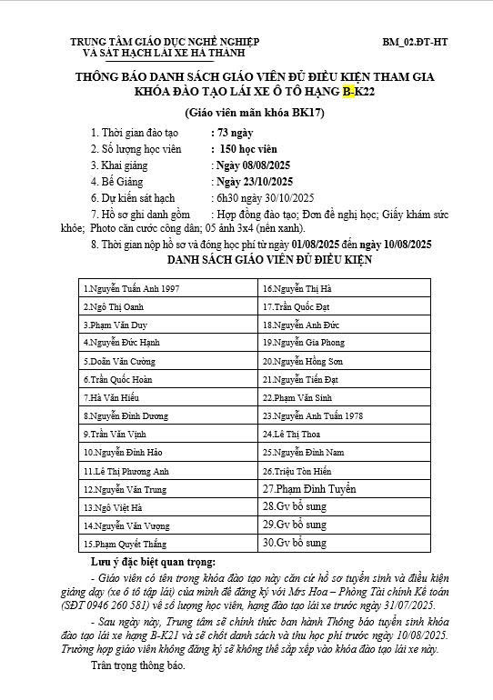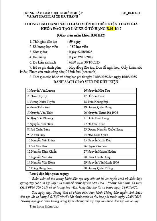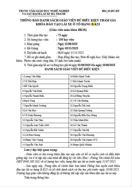 Học viên các khóa chưa thi hết môn lý thuyết, thực hành lái xe, giáo viên đăng ký với Mr Lê Sơn phòng đào tạo đến 12h ngày 23/08/2025 (đăng ký trong giờ hành chính).