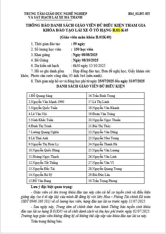 LỊCH KHAI GIẢNG KHÓA HẠNG B - K15