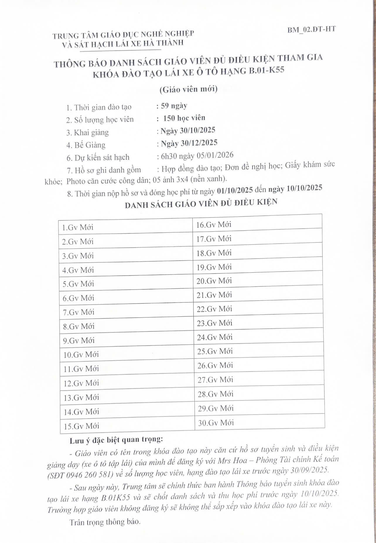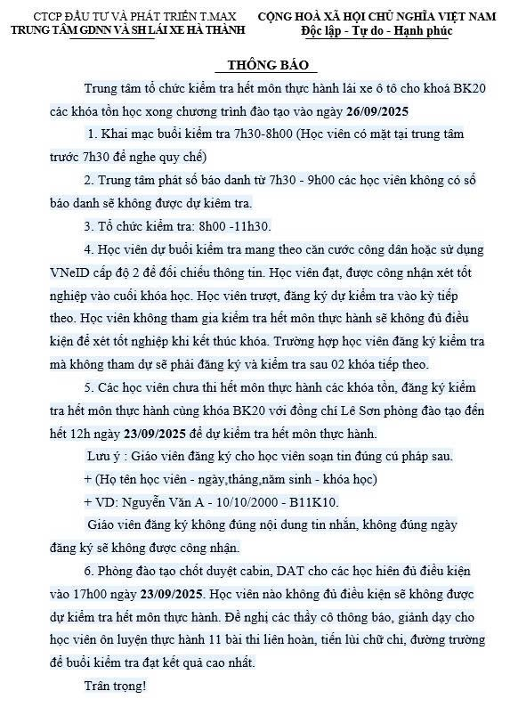 Học viên các khóa chưa thi hết môn lý thuyết, thực hành lái xe, giáo viên đăng ký với Mr Lê Sơn phòng đào tạo đến 12h ngày 04/09/2025 (đăng ký trong giờ hành chính).